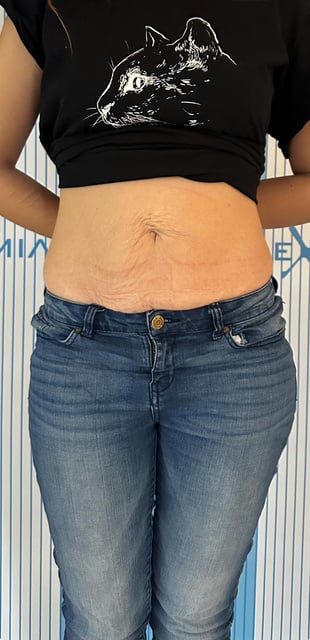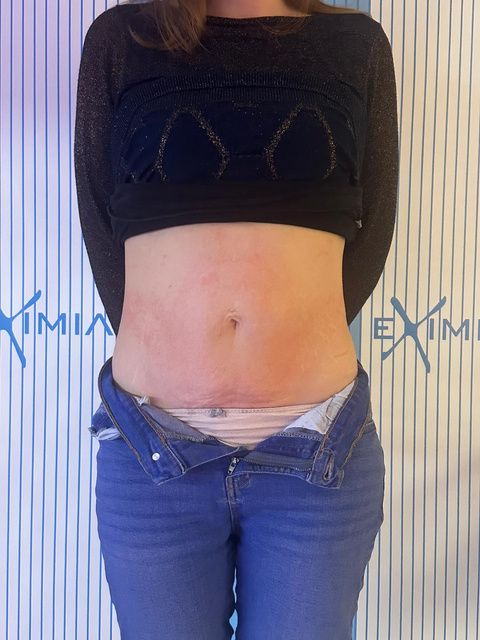 Klientka 30 lat, po trzech ciążach, zależało jej na ujędrnieniu skóry i pozbyciu się rozstępów. Efekt na zdjęciu uzyskany po dwóch zabiegach.